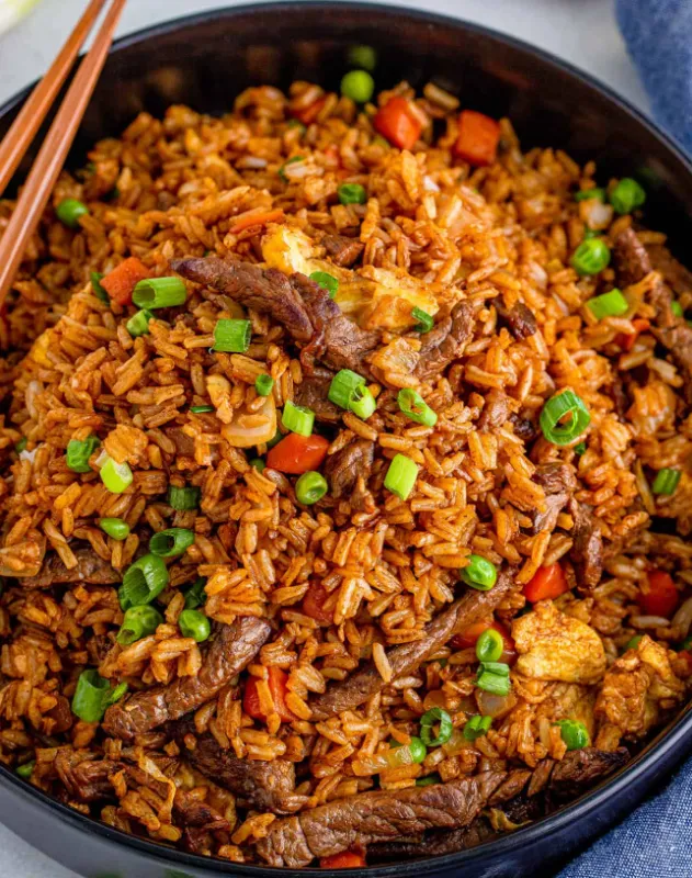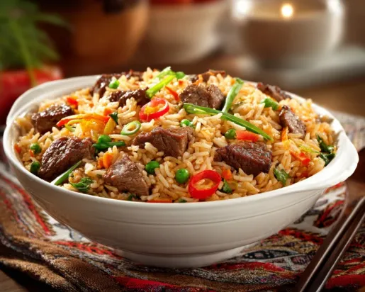 Savory fried rice with tender beef pieces.
