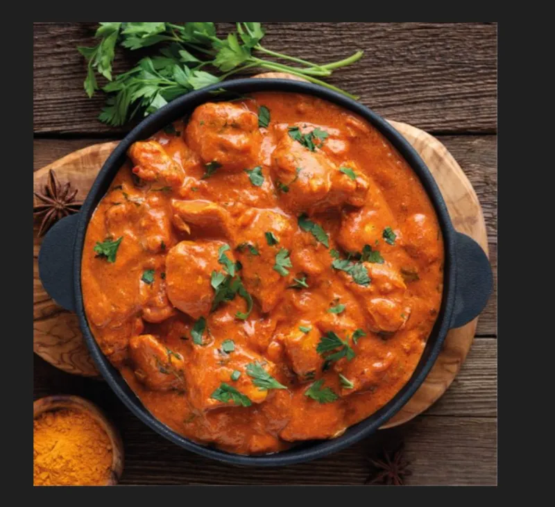 Creamy and rich chicken curry in a tomato-based sauce.