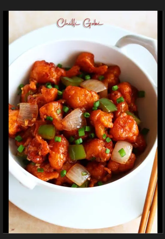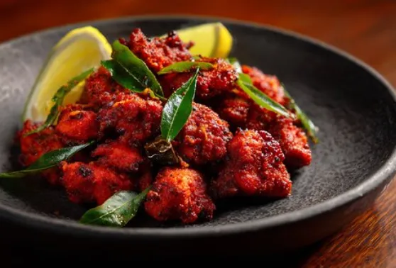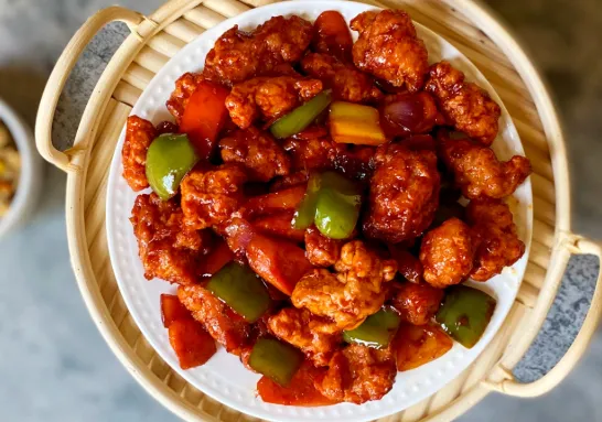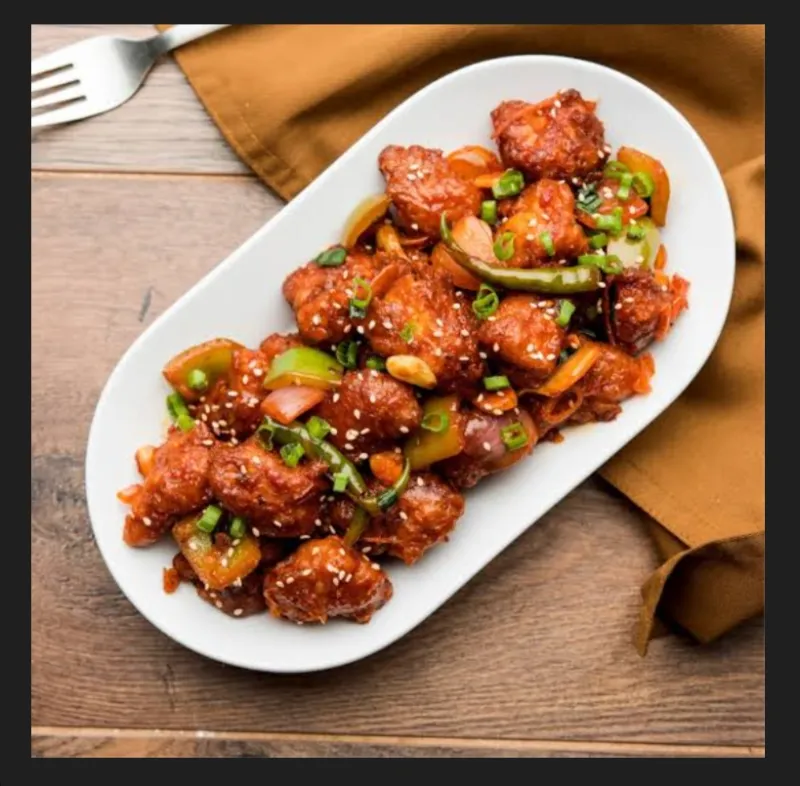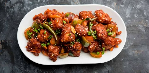 Indo-Chinese dish with deep-fried chicken in a sauce.