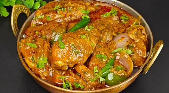 Spicy chicken dish cooked in a kadai.