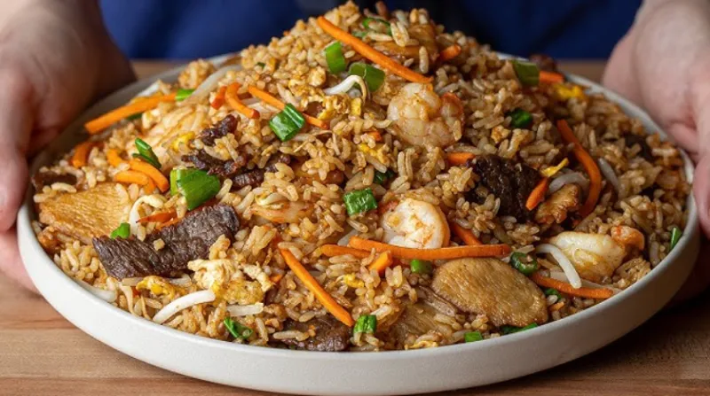 Fried rice with a combination of chicken, beef and vegetables.