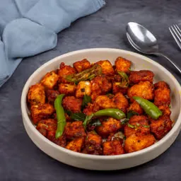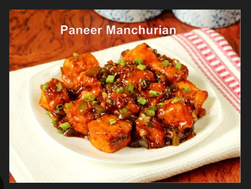 Paneer cubes in a savory Indo-Chinese sauce.