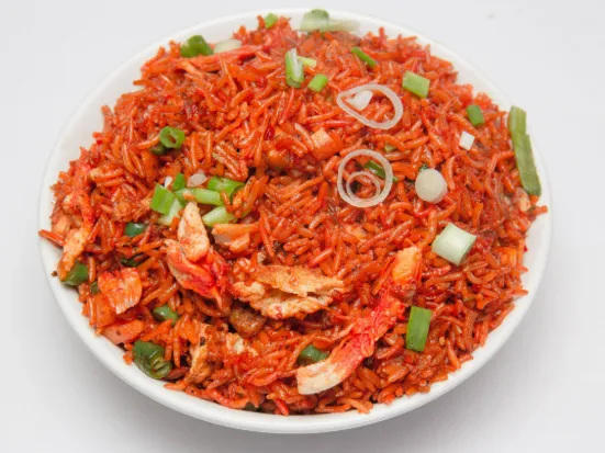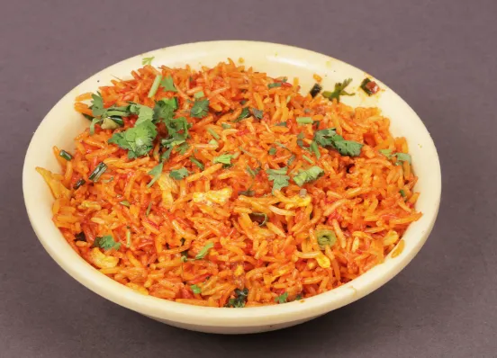 Spicy and tangy Schezwan-style fried rice.