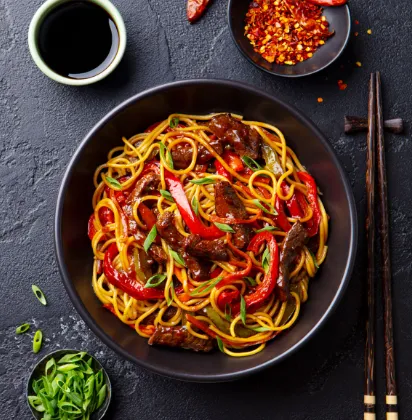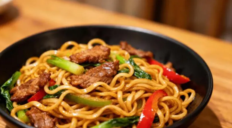 Noodles stir-fried with savory beef.