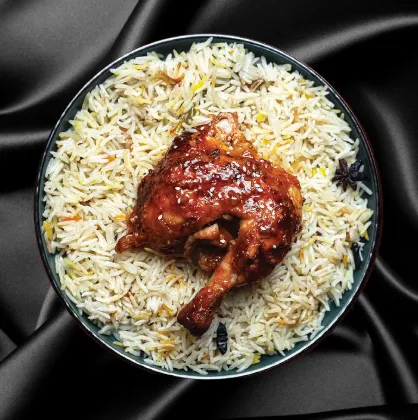 Mandi rice with peri-peri flavored alfaham.
