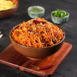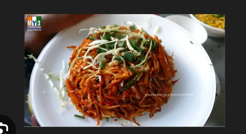Spicy Schezwan noodles with a mix of ingredients.