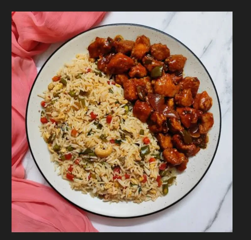 Chicken fried rice served with a side of chilly chicken.