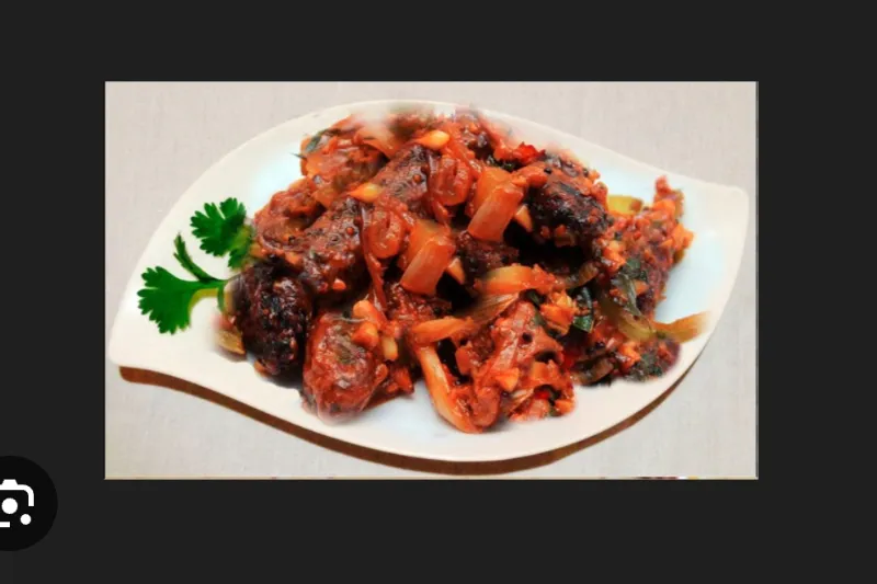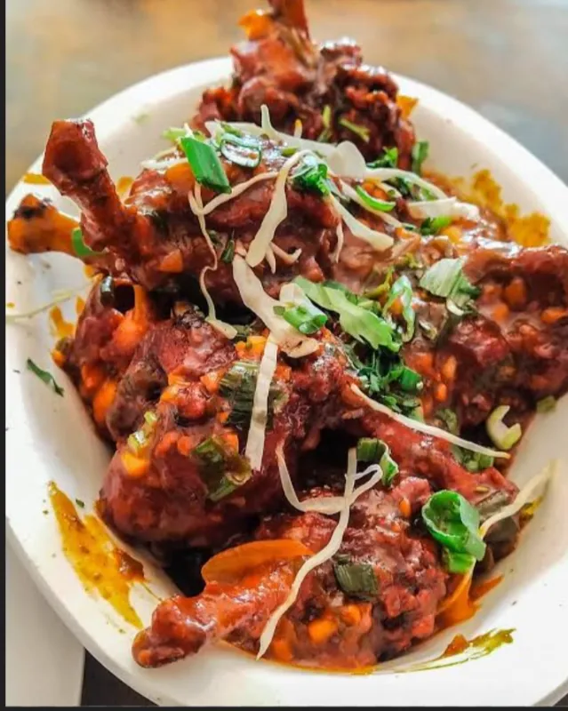 Tender mutton pieces in a spicy and savory chilly sauce.