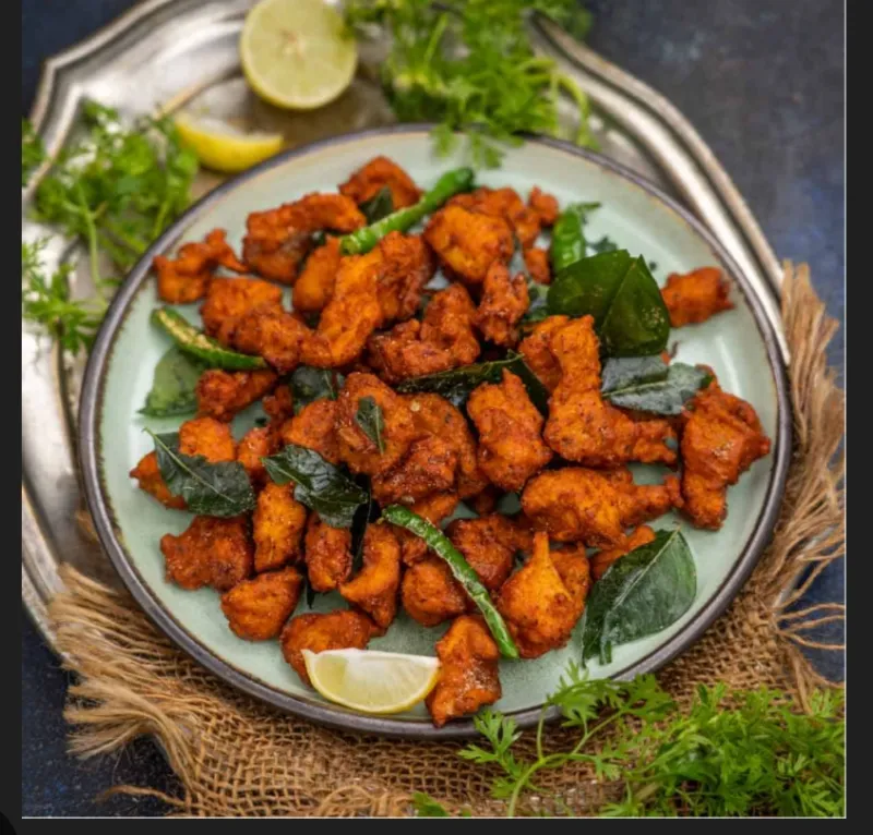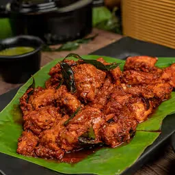 Dry chicken preparation, seasoned with aromatic Indian spices.