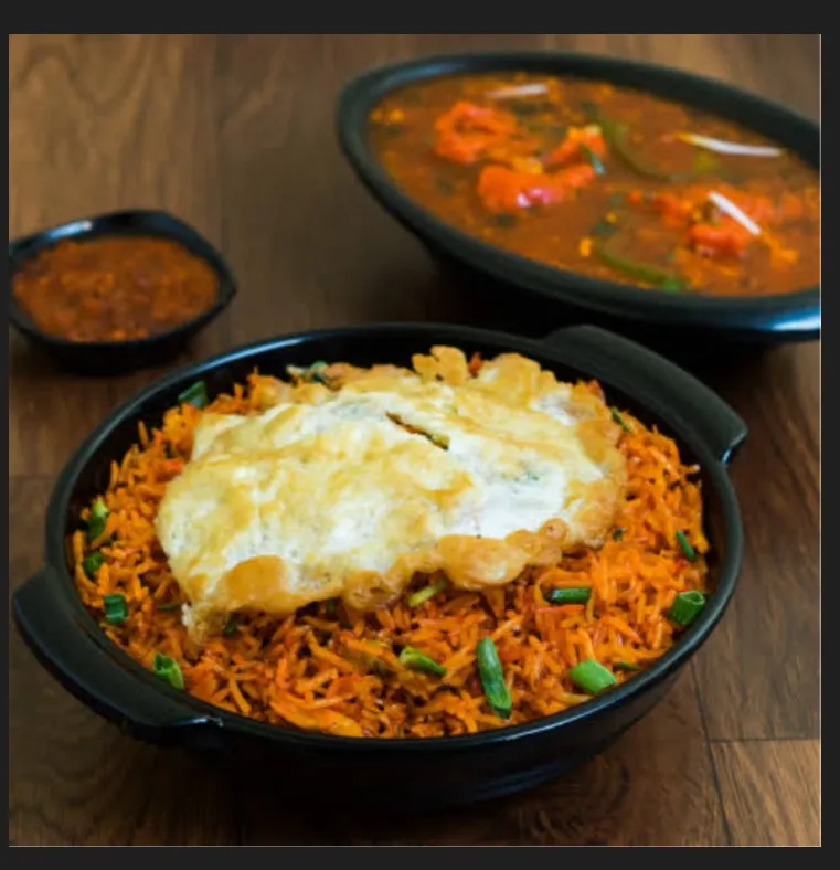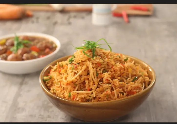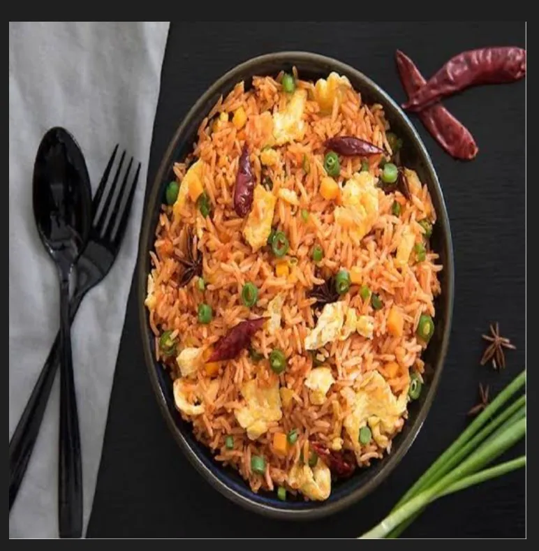 Spicy Schezwan fried rice with scrambled eggs.