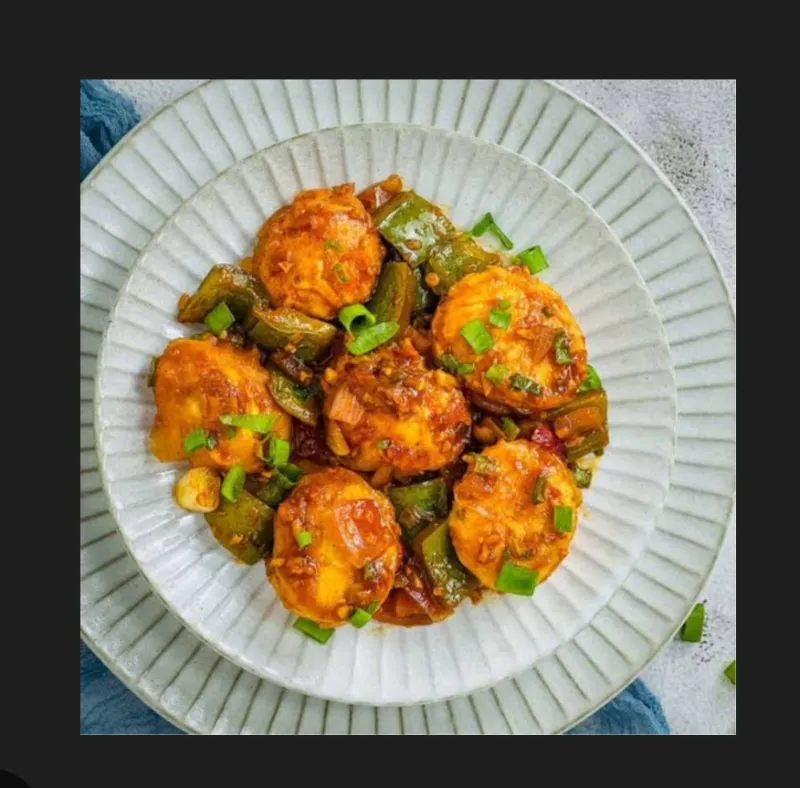 Boiled eggs in a spicy and tangy chilly sauce.