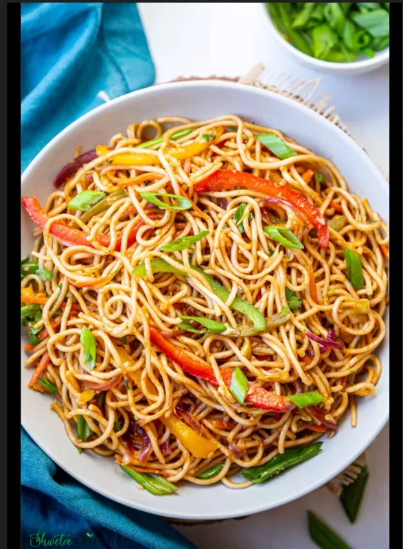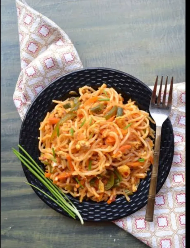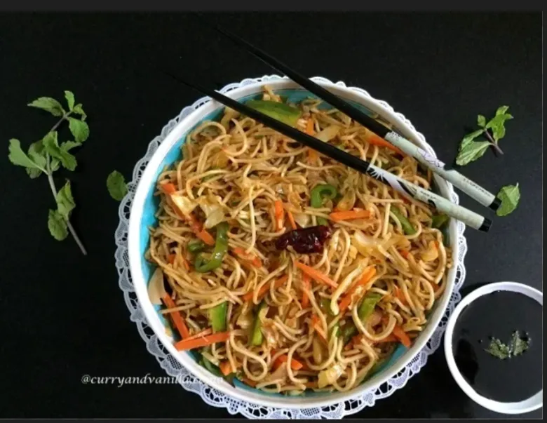 Spicy Schezwan noodles with mixed vegetables.
