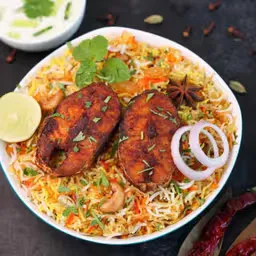 Fragrant biryani with tender fish pieces.