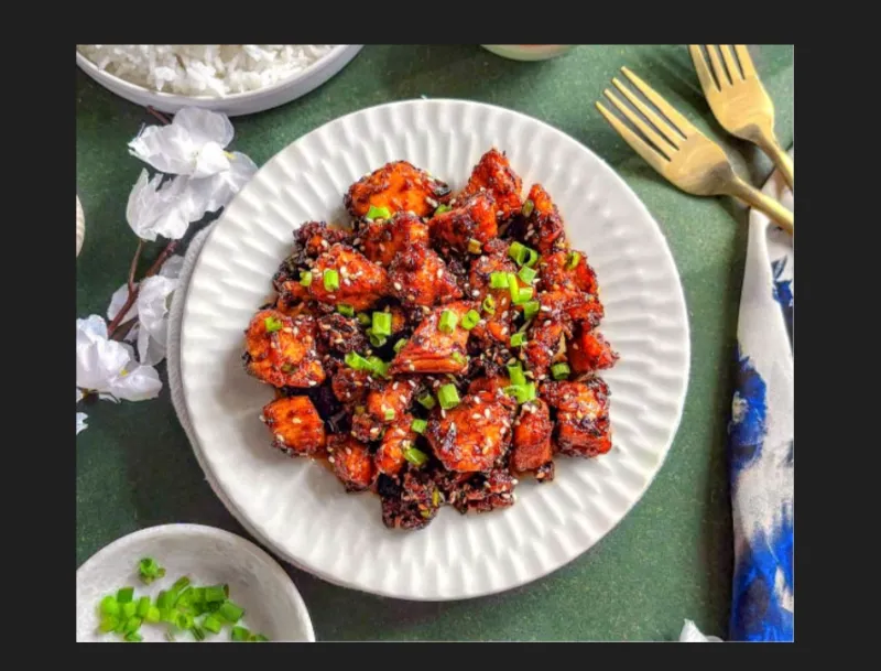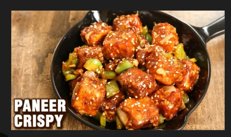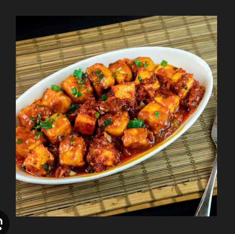 Paneer cubes tossed in a spicy and savory chilly sauce.