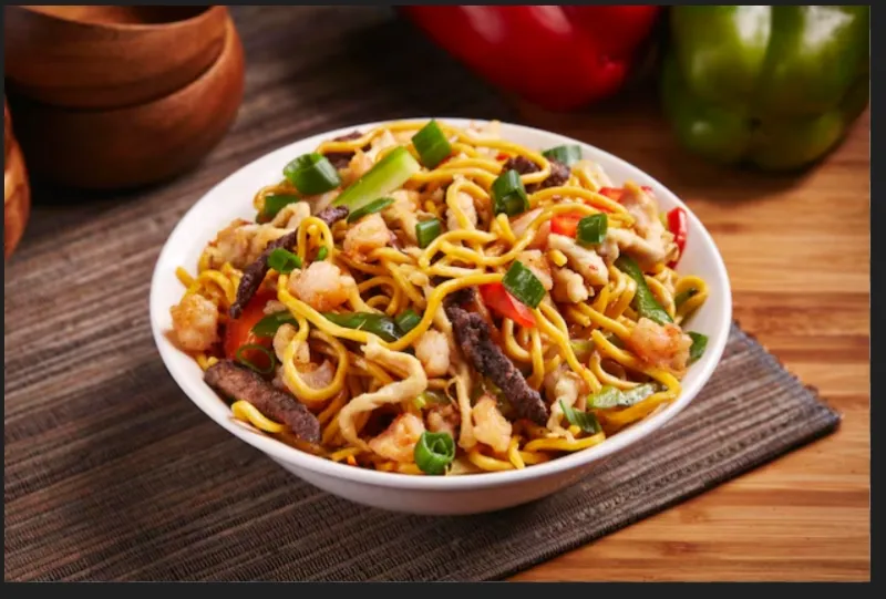 Spicy Schezwan noodles with chicken and vegetables.