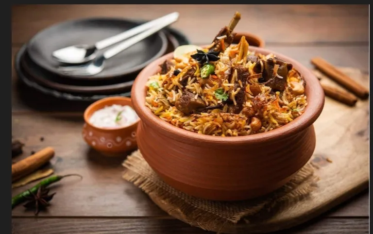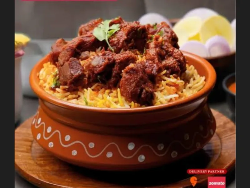 Flavorful biryani with tender mutton pieces.
