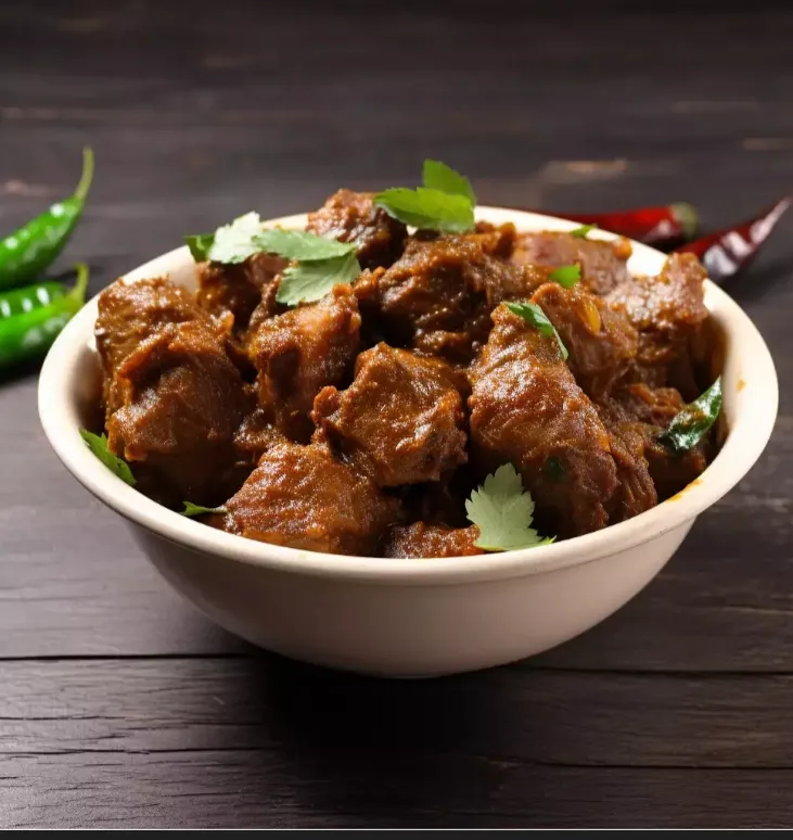 Boneless mutton in a rich and spicy masala.
