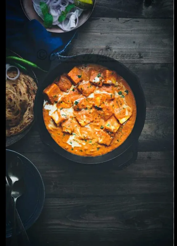 Paneer cubes in a rich and spicy tomato-based gravy.