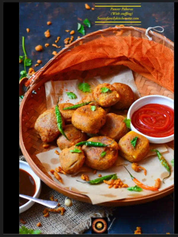 Crispy paneer fritters, a delightful vegetarian option.
