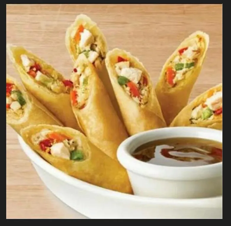 Crispy rolls filled with seasoned chicken and vegetables.