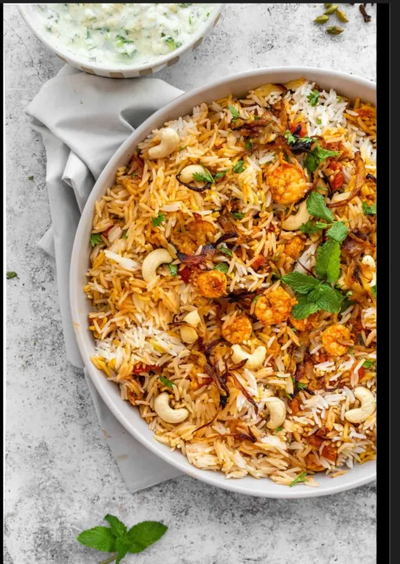 Flavorful biryani with succulent prawns.