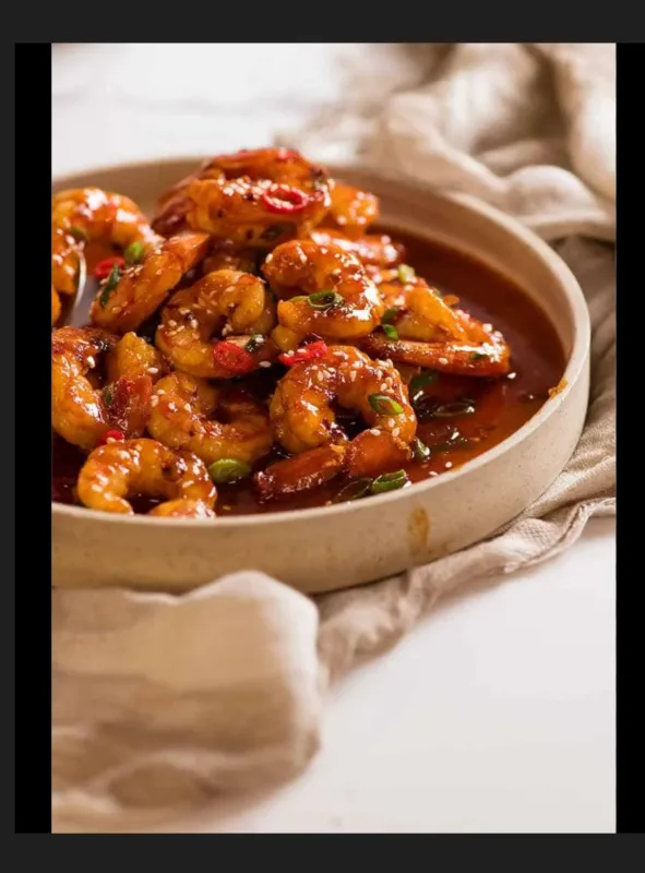 Succulent prawns in a spicy and tangy chilly sauce.