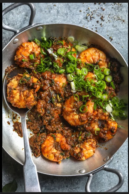 Prawns stir-fried on a tawa with spices.