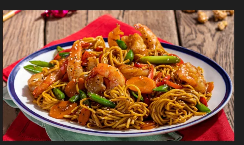 Spicy Schezwan noodles with tender prawns.