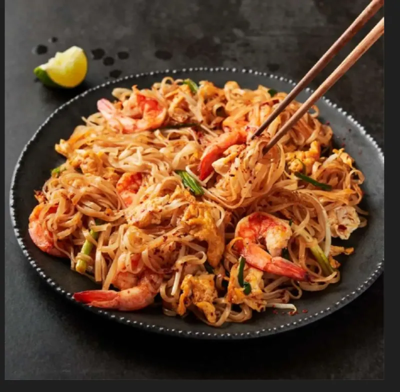 Noodles with succulent prawns and fresh vegetables.