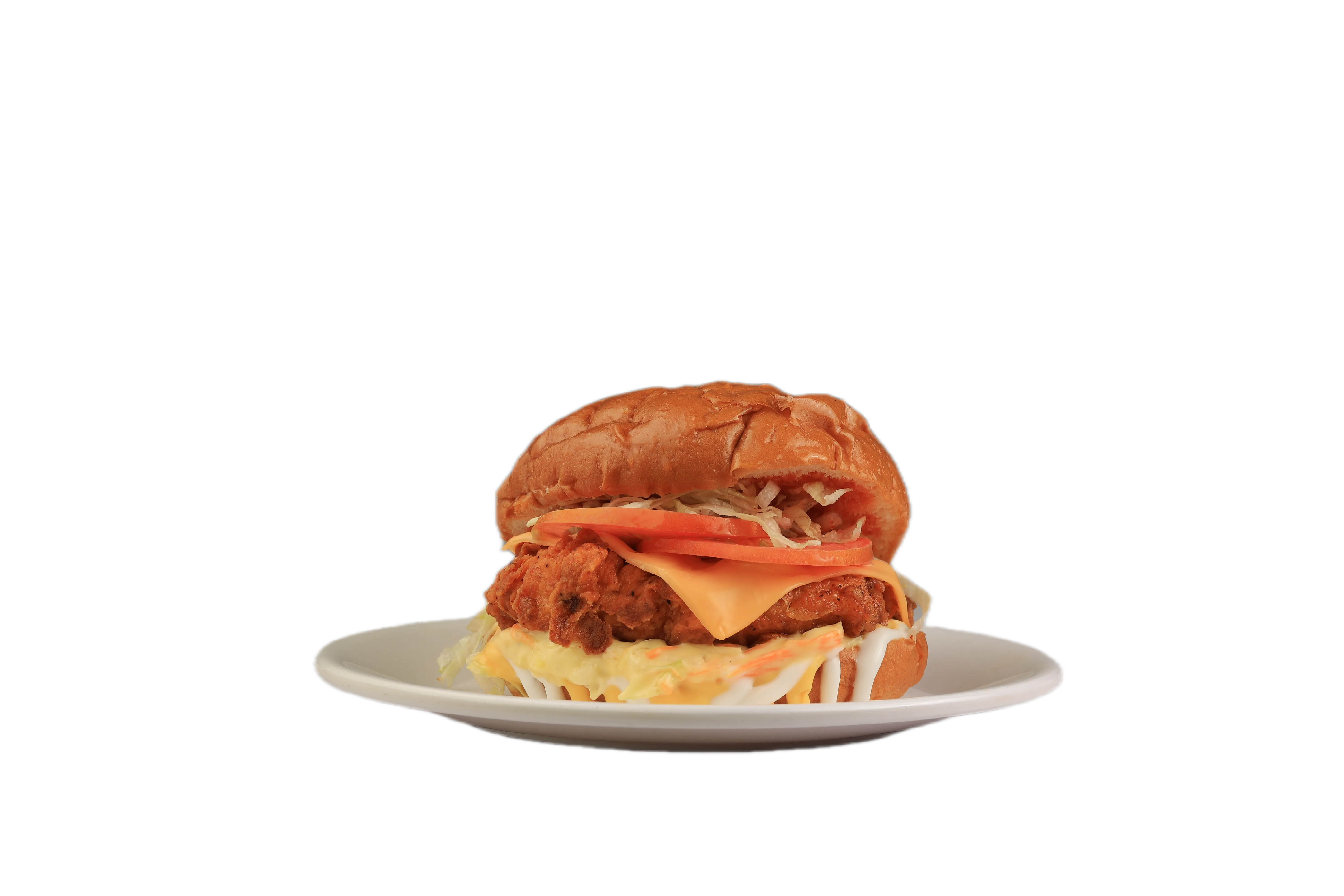 Juicy chicken patty, slice cheese, in-house mayo, BBQ sauce, onion, tomato.