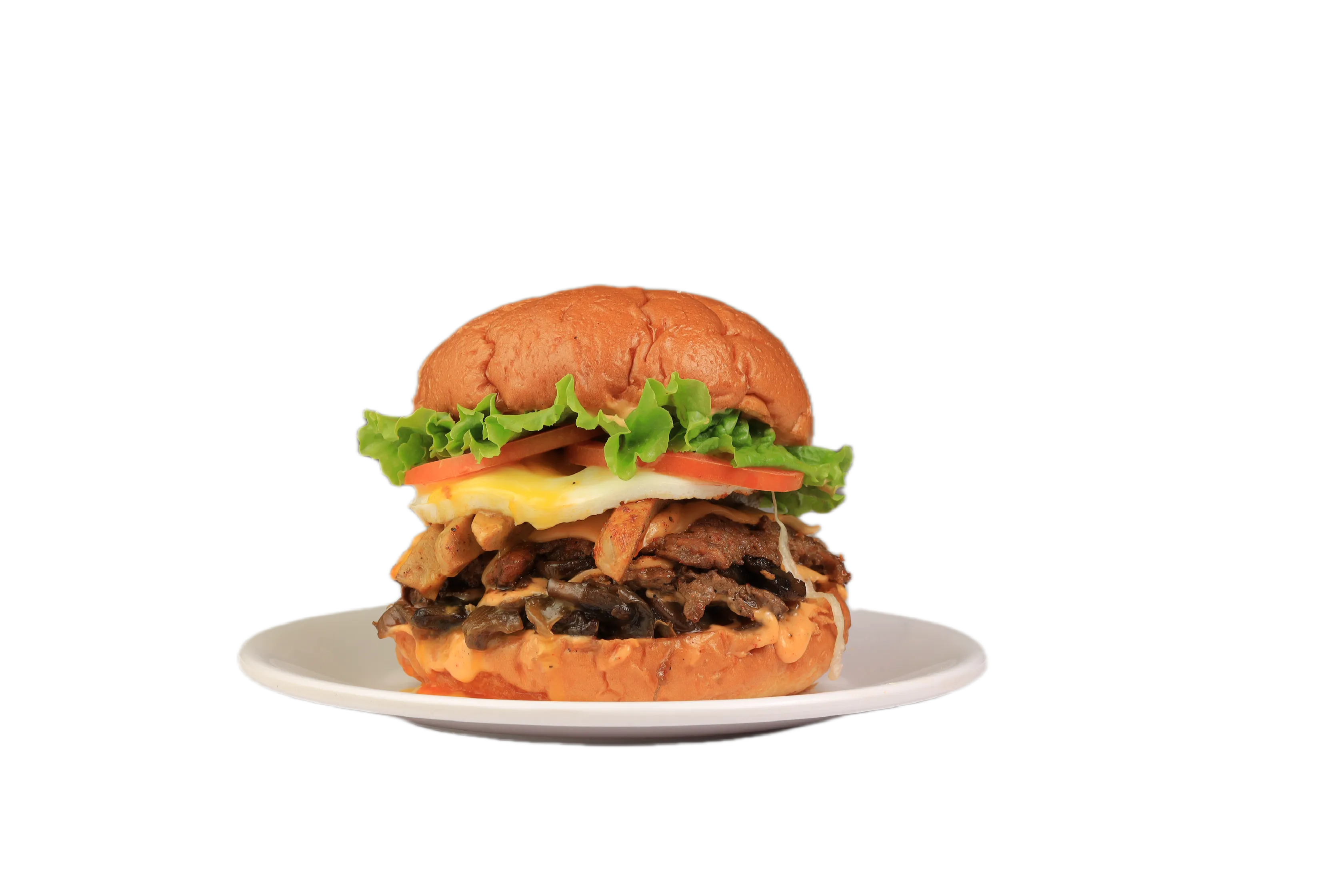Double beef patty, triple cheese, sunny side up, caramelized onion & mushroom,sausage,special sauce,tomato,lettuce,tangy pickle
